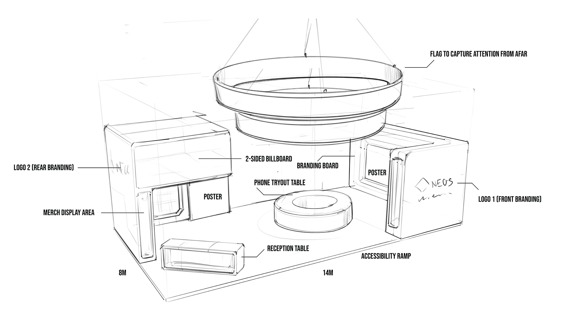 In this project, I tasked myself with creating a brand from scratch, a phone design, and a detailed design of an exhibition booth for the phone release.